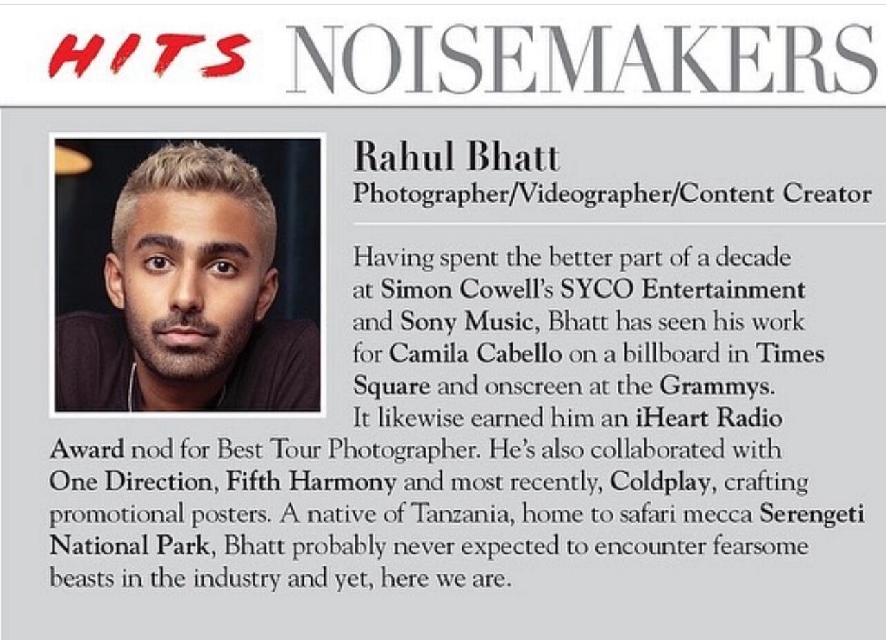 Rahul Bhatt is a multimedia Creative Director based in Los Angeles and London with over 10 years of experience in the entertainment industry. With a specialty in visual content, photography and video, he develops and produces 360° digital and content campaigns for chart-topping artists (Coldplay, Camila Cabello, Nicki Minaj, Jennifer Lopez, One Direction, Ava Max, Little Mix, James Arthur) and international television franchises (Got Talent, The X Factor).